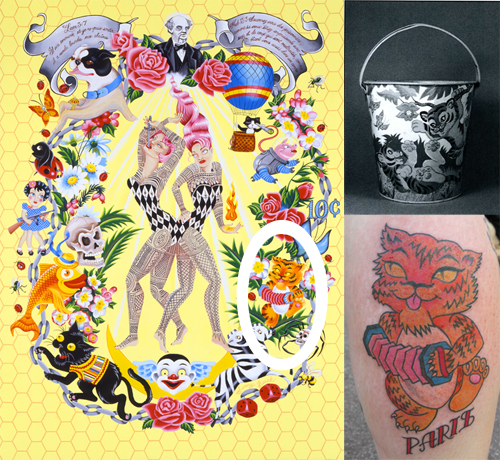 The original tiger was found in a book about tin toys. I painted it in 2001 playing an accordion. 2009 at the Paris tattoo convention I tattooed it on Keegan from San Francisco!