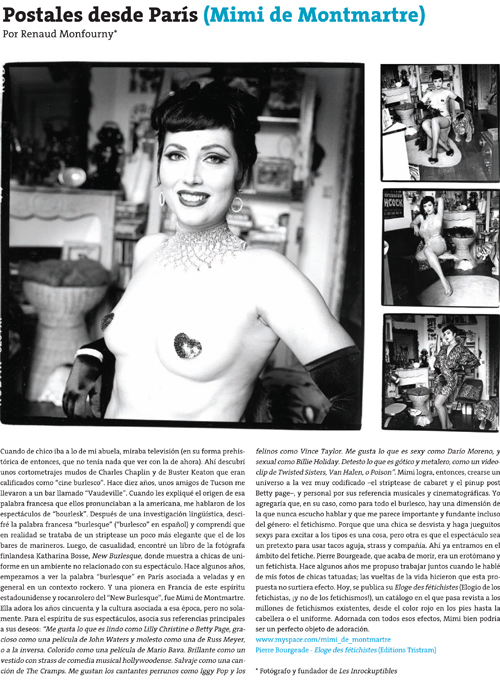Mimi de Monmartre, burlesque personality from Paris in the pages of Inrockuptibles. Mimi had a dream to do authenitic 1950’s burlesque, and I helped her in a way in the begining. I’ve made several of Mimi’s stage costumes, which I will tell you about later. You will find Mimi doing gogo dancing at one of Europe’s many garage rock festivals or performing in chic night clubs, during burlesque festivals. She’s a real Parisian Beatnik and I adore her style! Mimi and her boyfriend Fred once saved my life, it’s true! She’s beautiful from the inside out. Gros bisoux ma chere et encore merci pour tout surtout d’être mon amie!