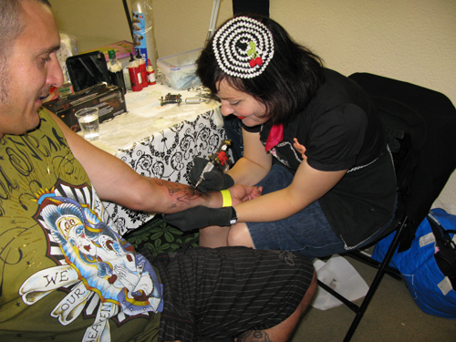 Here’s some photos, the tattoos, me at work and my lovely assistant Charlotte.