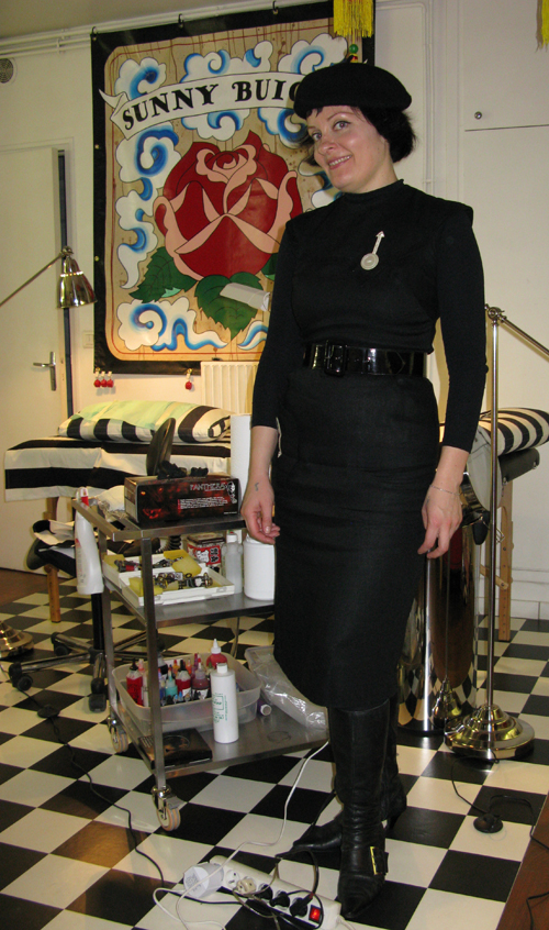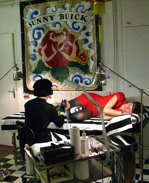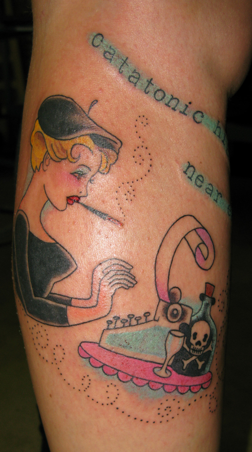 Yesterday was really fun. I tattooed Maiwenn another fan of the Beat Generation writers. She got a girl beatnik creating at her typewriter, while smokin’ and drinkin’, with the words: catatonic highway and near ecstasy from “Howl” by Allen Ginsberg. I dressed up for the occasion! We listened to “Beat Jazz”, Miles Davis “L’Ascenseur pour échafaud” and the great Jimmy Smith. I love the Miles Davis album which was the soundtrack to a french film, it was recorded in Paris. I love Jimmy Smith because it mixes the organ and jazz, but makes me visualize circuses and old movie theatres.