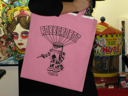 Here’s the robber robot again. I decided to try printing cloth bags and see how it goes before I start doing some t-shirt designs. If you’d like a chance to win this bag please leave a comment and I will pull a name.
