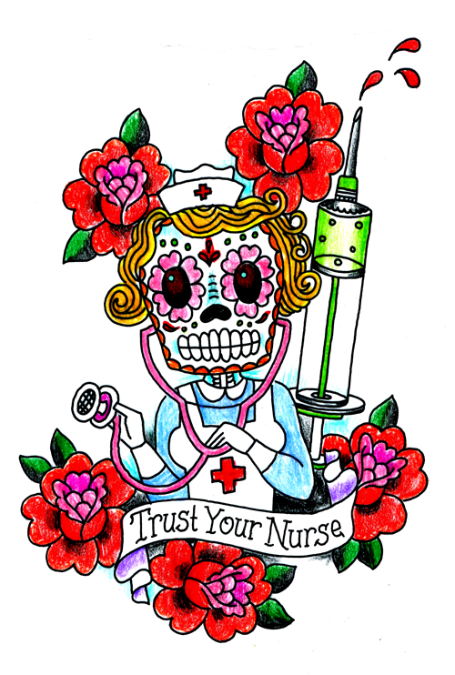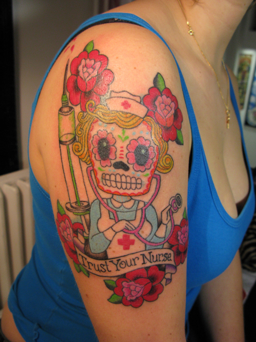 I’ve been searching for a tattoo like this. It not only had the day of the dead tradition but also my passion for nursing. As soon as I finish nursing school I’m want to get a tattoo like this. I believe I was born to be a nurse and I’ll die one.
