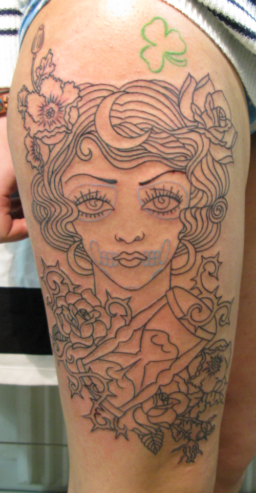 I’ve been lagging on the blog as I’ve been so busy getting ready for Milan and drawing for so many projects. Here’s a big tattoo I got started last week. I can’t wait to work on it some more.