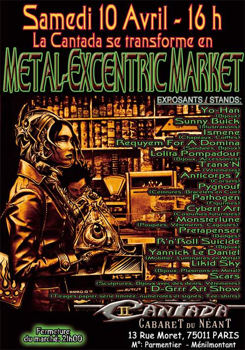 Le Metal Excentric Market de printemps; une quinzaine d’exposants vous présenterons leurs créations ceci à partir de 16h00 jusqu’à 21h00 (tee-shirts, parures, gants, bijoux, accessoires, latex, disques, zines, livres, reprographies etc…). Ce marché est représentatif de l’état d’esprit de la Cantada; des créations exhubérantes, hors des clichés rock ou goth habituels, des piéces uniques, une atmosphére dominée par le métal sous toute ses formes; ce marché s’adresse à un public ouvert en quête d’originalité et de belles choses.