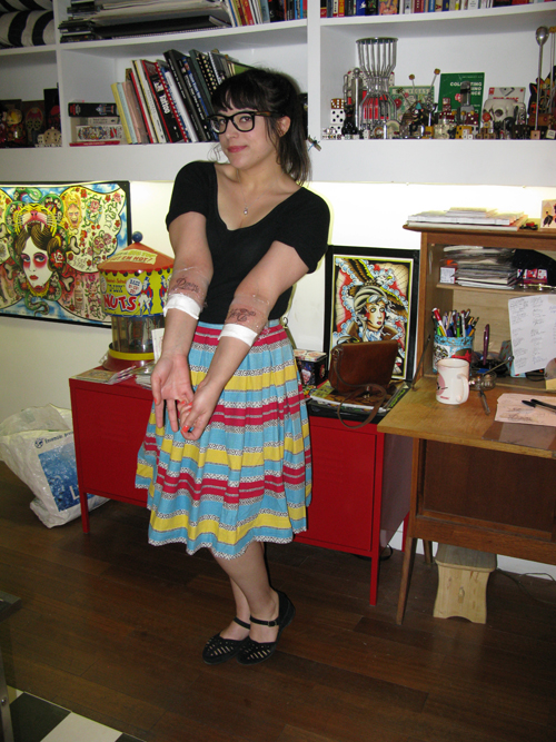 Check out Maura’s awesome vintage ensemble. She got “Dusk” and “Dawn” tattooed on her forearms.