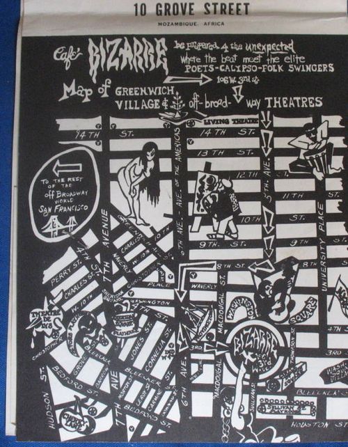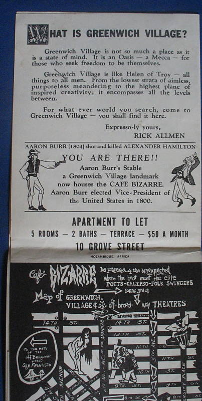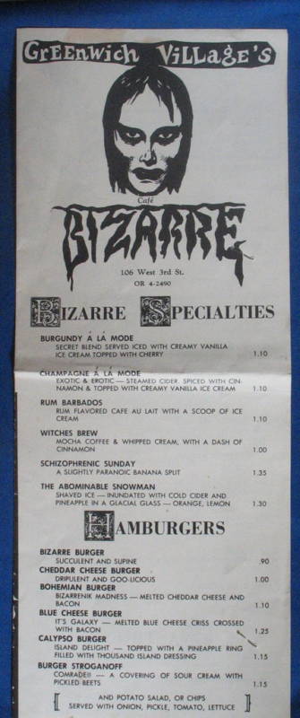 Menu from “Cafe Bizarre” in Greenwich Village, 106 West 3rd Street. Famous and colorful 1950s and 1960s coffeehouse, one-time hangout of Beatnik poets, Andy Warhol, the Velvet Underground, an early James Taylor group, misc. folk singers, and Aaron Burr’s ghost (the building was originally Burr’s stable). Painter Larry Rivers had a studio upstairs, by the way. Singer and uke player Tiny Tim had his first paid engagement here. Owner Rick Allmen started it in 1957 with $100. Whole block was demolished in 1983 for an NYU dorm.