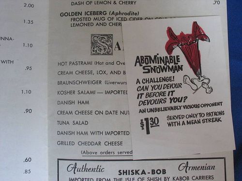How cool is this? A menu from a genuine Greenich Village Beatnik cafe with Famous Monsters graphics. The cafe was apparently haunted as it was built on the site of Burr’s stable where Aaron Burr murdered Alexander Hamilton. Here’s the seller’s description: