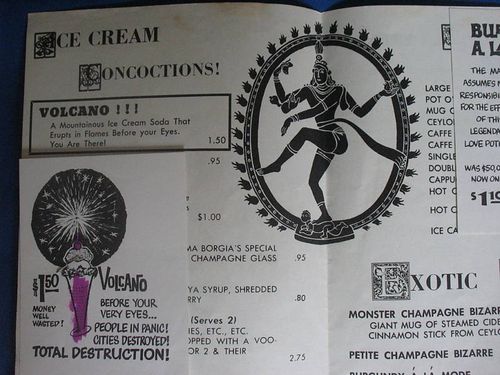 Menu has some ordinary fare like burgers and hot pastrami, but mostly features ice cream concoctions and exotic drinks (non-alcoholic). Among the items: the Volcano, a mountainous ice cream soda that erupts in flames before your eyes; a Schizophrenic Sunday, a slightly paranoic banana split; and a Rum Barbados, a blend of choice and rare ingredients imported by camels from Secaucus, New Jersey. Small cards for four drink “specials” have been stapled onto the menu. Back of the menu shows an appropriately bizarre map of the Village, and a quote from owner Rick Allmen: “Greenwich Village is not so much a place as it is a state of mind. It is an Oasis–a Mecca–for those who seek freedom to be themselves….”