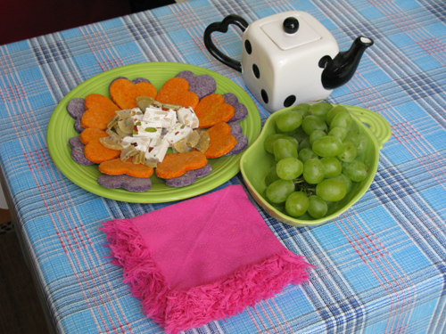 Dried kiwi, green grapes, Dice teapot from my belle-soeur with pearl de jasmin tea inside, pink napkins with pretty bow jacard motif found in Antibes, plaid oil cloth found in Sebastapol on our last trip to the US.