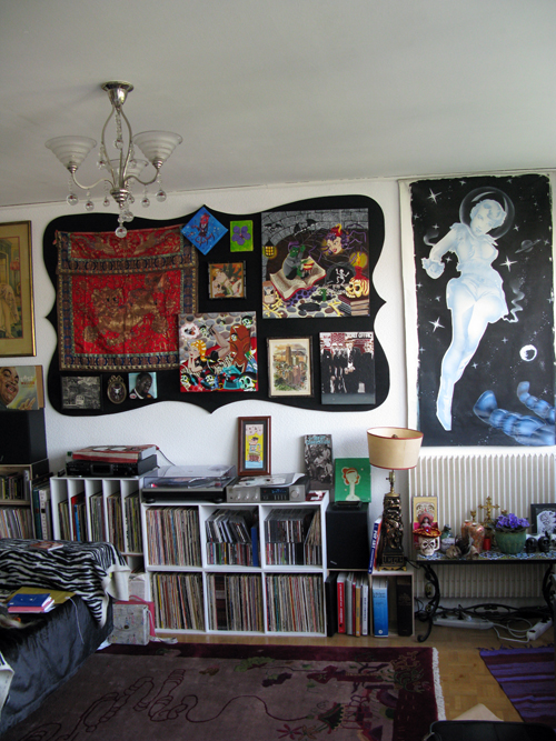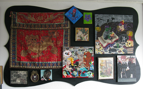 In order to hang all my little to medium paintings (some mine, some painted by friends) I devised this system. I ordered a large piece of plywood and had it delivered. It didn’t fit in the elevator we had to carry it 11 floors up! I had a friend come over and cut out the shape. We even hung it up straight away. I needed help after all! Next I painted it and hung all the paintings. I think it will change and evolve over the years. I thought about gold leaf… some future day perhaps.
