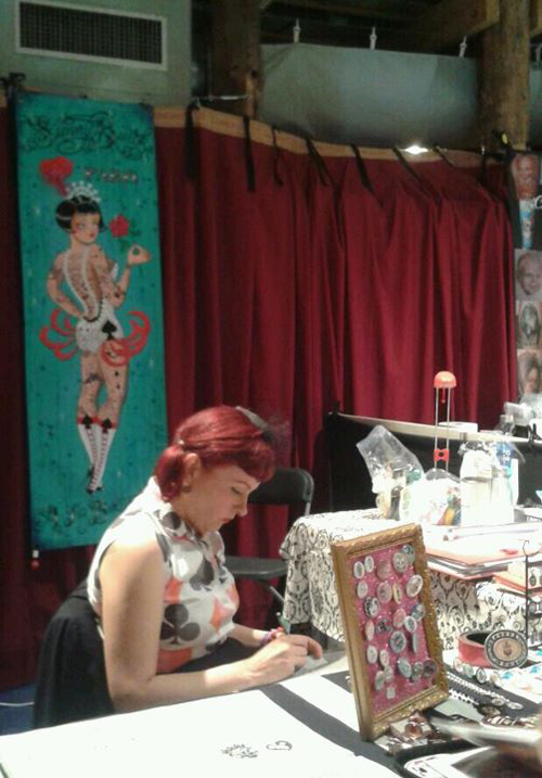 I unveiled my new banner at the Paris Tattoo Art Fest last weekend. I wanted something that would be easier to travel with. This banner can be rolled up and fit in a suitcase, the old one needed to be folded and was all wrinkly on arrival. The idea was a tattooed burlesque dancer in a Queen of Spades costume (Dame de Pique in french). Pique means, spade, or to stab or prick in french and my shop is called A La Belle Pique (because I like to prick people with my tattoo needles, haha!). I even got a spade shaped hat from Topsy Turvy on etsy to wear all weekend. Fun!