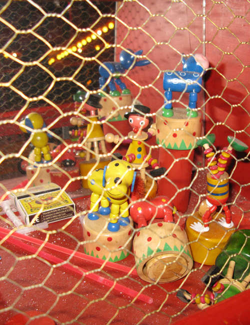 At the MAF you can find three steeplechase games. 10 holes in an inverted triangle on a accending slope. The object is to roll a ball up the ramp and each time your ball falls through the right holes your figure advances. The races include: