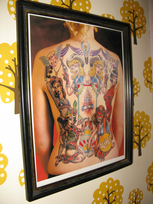 Photos from our stay in a real gypsy wagon, photos of my grandmother, a really great bakelite and rhinestone crucifix, some of my sugar skulls, all the little personal touches I added to make the space really mine.
