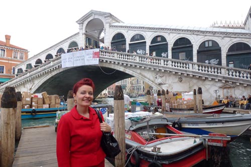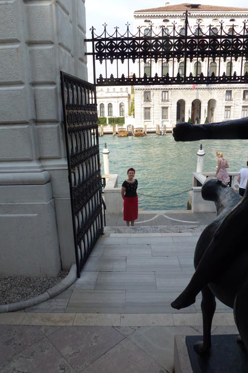 I visited the Peggy Gugenhiem museum which is in her former home. She was so glamorous! Great photos on exhibit of her in the house or sunbathing on the terrace where you see me. In her bedroom she had all her earrings hung on the walls and a beautiful silver wire sculpture over the bed by Calder.