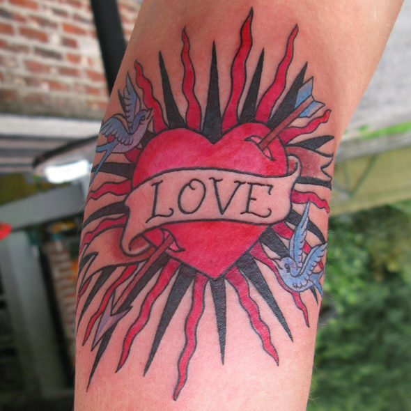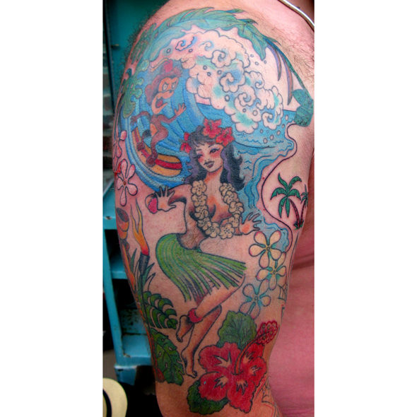 I went to the countryside just on the border of France and Belgium to tattoo some friends. There’s still a little more work to do on Remy (the hula dancer and monkey surfer).