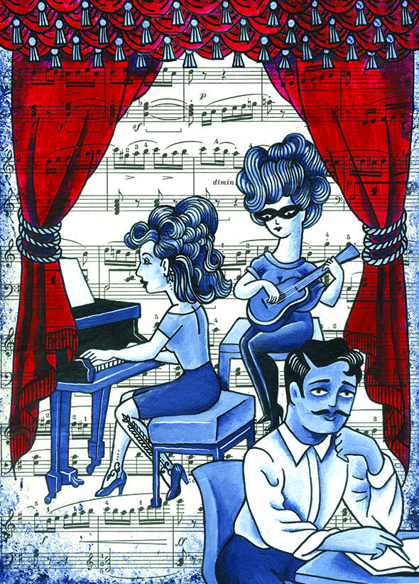 The original art above and the printed results below. Acrylic paint on old sheet music.