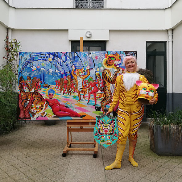 This painting has a literary reference, when reading Angela Carter’s: “Nights at the circus”, a striking visualization came to me. There is a passage where Mignon, a minor character sings with the Princess of Abyssinia and learns that she can hypnotise the tigers with her voice and then eventually develops the courage to dance with them. The force and the strength of the tiger in contrast to the semi-nudity of the women in the painting suggests the disproportion, the enormous gap, in the fight against sexism and oppression. This discord, the extent of the unfairness shows how hard the combat will be. I like the absurdity of the idea of such an impossible feat (taming a tiger), breaking its natural impulse, too dangerous; simply stupid or naive, tempting such peril. First of all the tiger is armed with superior weight, claws, and fangs! Plus femininity values frailty, beauty, and fragility; but what good do those attributes do you on the battlefield? And navagating sexual politics in this society is like going to war. Women’s keys to breaking down traditional roles of passivity and aggression are fearlessness, trust, and patience, reversing the roles of predator and prey. We learn roles, we learn our places in society. Are we just animals that have been tamed and trained ? The Marquis de Sade said that we are either predator or prey, and that “predators must and will devour their natural prey”. To escape the role of the sacrificial lamb, (to be a piece of meat), his suggestion for women was to adopt the characteristics of the predator; because it is an “eat or be eaten” world. But if we want a better society; this is not the solution! The women in my tableau are learning from the tigers how to stage a revolution, not by copying the patriarchal model or adhering to any dogma. No leaning on established beliefs or religious doctrine; just using their own experience, developing an animal instinct.