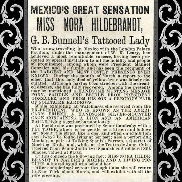 Nora Hildebrandt was the first tattooed woman circus attraction. She was first exhibited in 1882, eighteen years after the international success of Captain Contentus. Like him, her official biography consisted of a tale of being forcibly tattooed in captivity. She recited that she was forcible tattooed by her father, Martin Hildebrandt. He had been invited to tattoo the tribe of Sitting Bull, who then accused Martin of trying to poison them. As punishment or to prove his innocence, he was forced to tattoo his daughter from neck to ankle. A story full of sex and danger, hinting at rape and incest. The far less interesting truth was that the they were common law man and wife. Stories like theirs were fabricated to entice the public. These stories also capitalizing on contemporary fears and anxieties about the «other». Furthered ideas of the «helpless woman» and assumptions that tattoos were marks of the savage.
