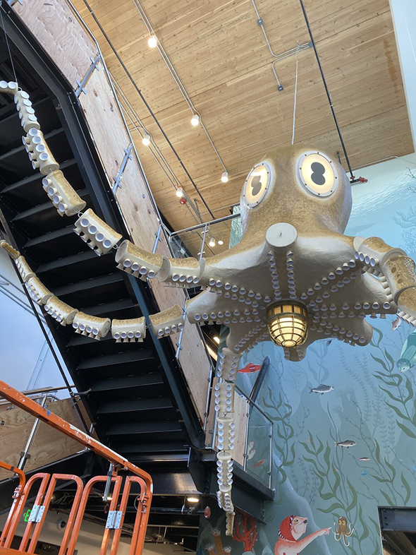 and a reticulated octopus sculpture accompanied by an under water mural for the entrance to a health food store.The mock up: