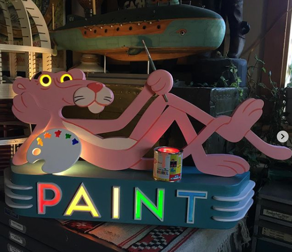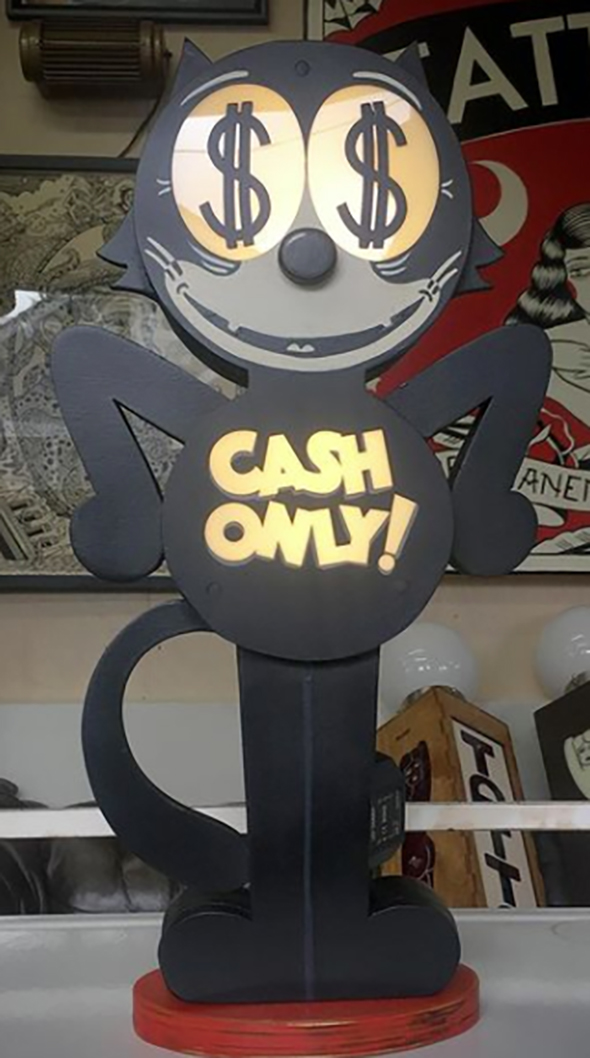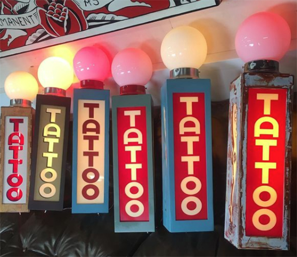 In his work there are often signs for cheap hotels, drug stores, truck stop restaurants and diners. Tattooers in the past hand painted signs as a side gig. Showing words also make references to the writing of Jack Kerouac, the father of the Beats.