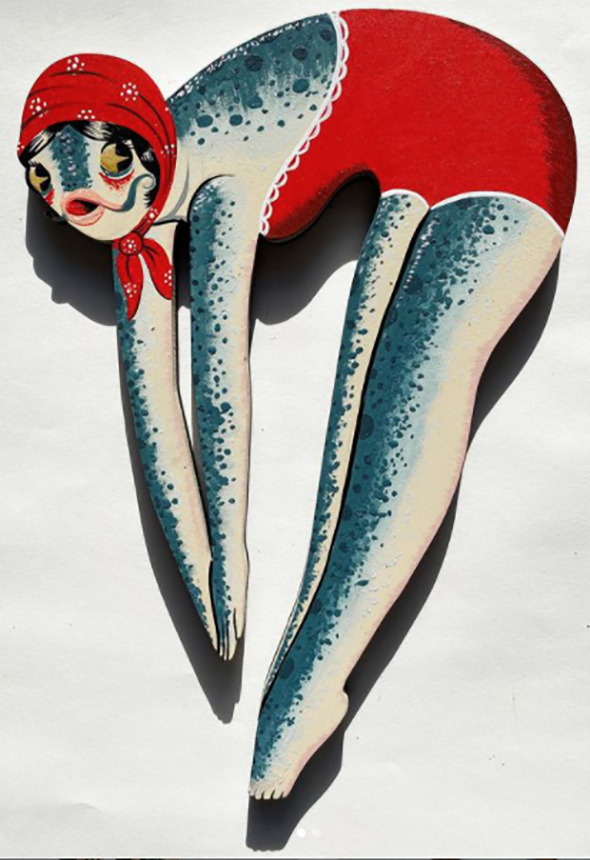 and cut out lady divers. He often makes these lady divers with fish heads, like the opposite of a mermaid in either tattoos or cutout wooden plaques.