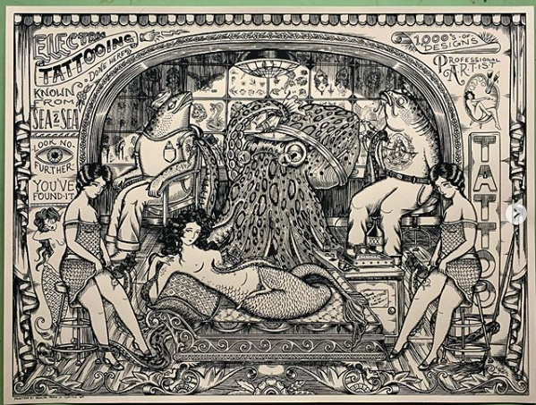 Let me describe one of Martz’s illustrations. An octopus tattoo artist busy with all 8 of his tentacles, tattooing two sailors, two women and a mermaid who is lounging like an odalisque, wiping his head with a handkerchief, and the last tentacle wrapped around the ankle of one of the women (perhaps his favorite?) There is a bottle of alcohol near him, with three x’s. Under an archway, behind him is a wall of old school tattoo designs. The tattoos in progress include a chest piece on a catfish sailor, mermaid on arm of other fisherman sailor, skull on the thigh of one of the ladies.