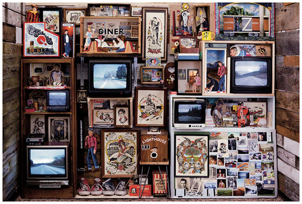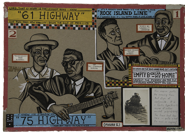 There’s something about Kuhn’s work that reminds me of old fashioned songs about tent revival meetings (where traveling preachers would evangelize a local population). Drifters, trains, and beatniks populate his mixed media objects and paintings. One of his installations included a sound collage. Real phone calls with his family, clearly evoking the distance between people, while giving his father a chance to explain the reasons for his frequent departures.