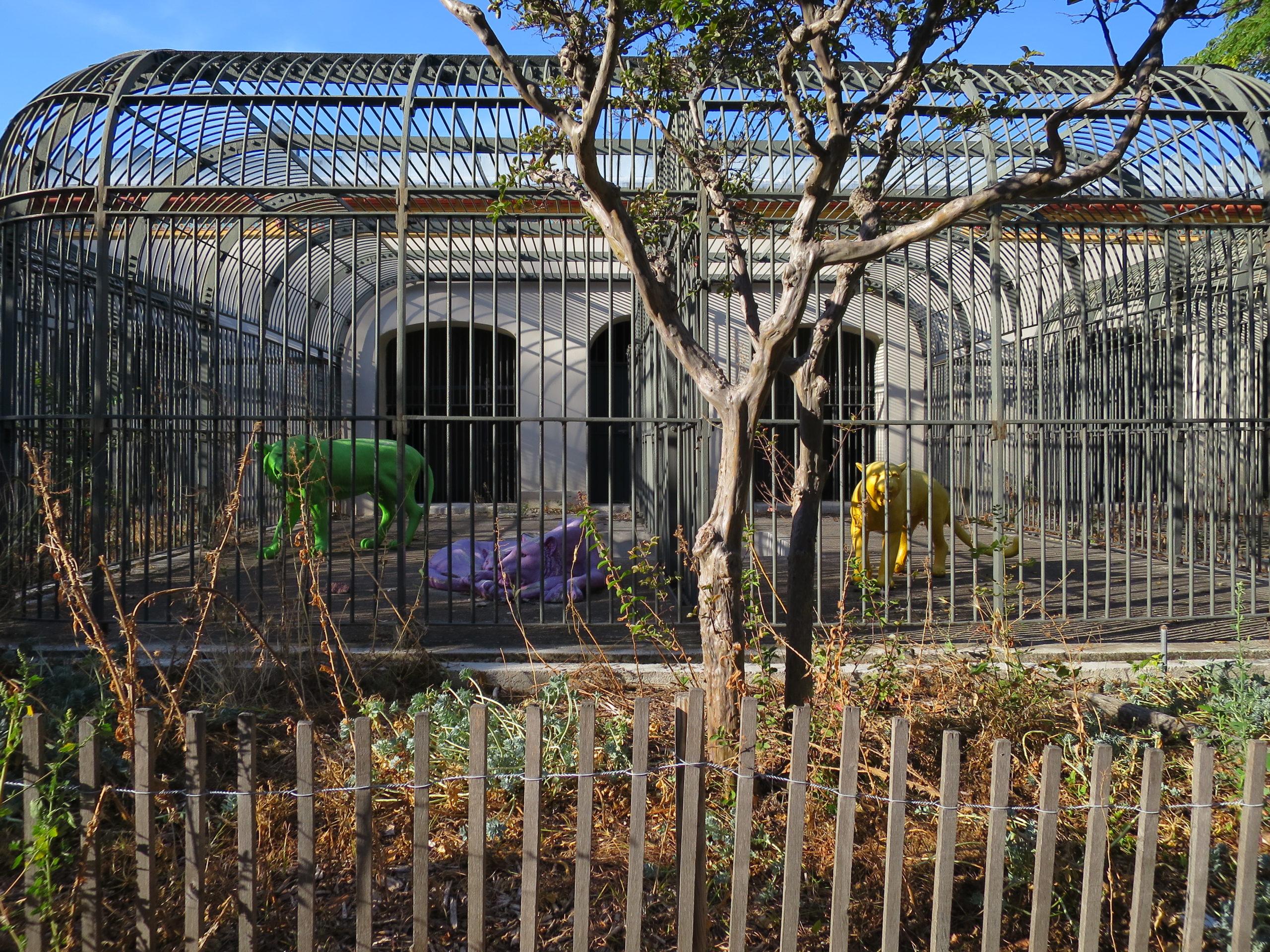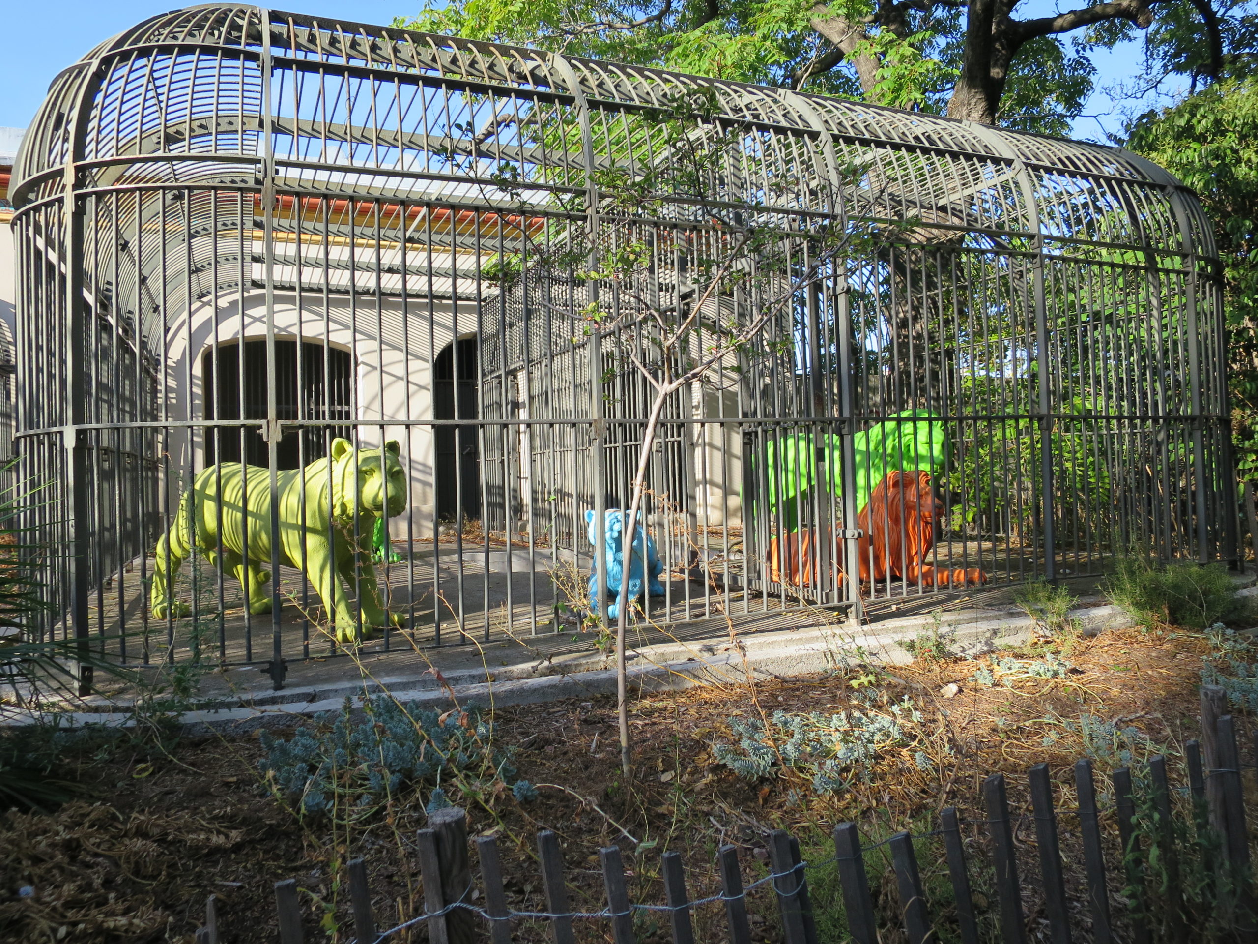 Behind the museum is an abandoned zoo. There are some strange art? sculptures now in the cages.