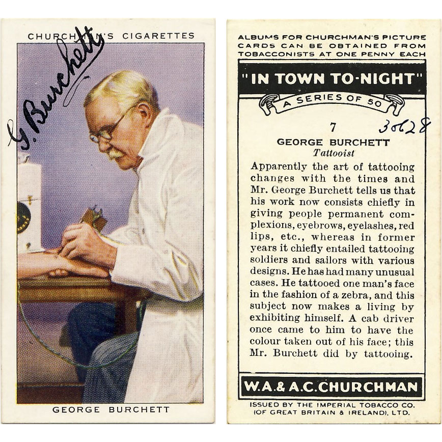 There is a memoir of George Burchett “Memoirs of a Tattooist” edited by Peter Leighton. It was published in 1958 by Oldbourne Book Company and includes photographs illustrating some of his tattoo designs. There is a more recent book by Jon Reiter, The King of Tattooists.