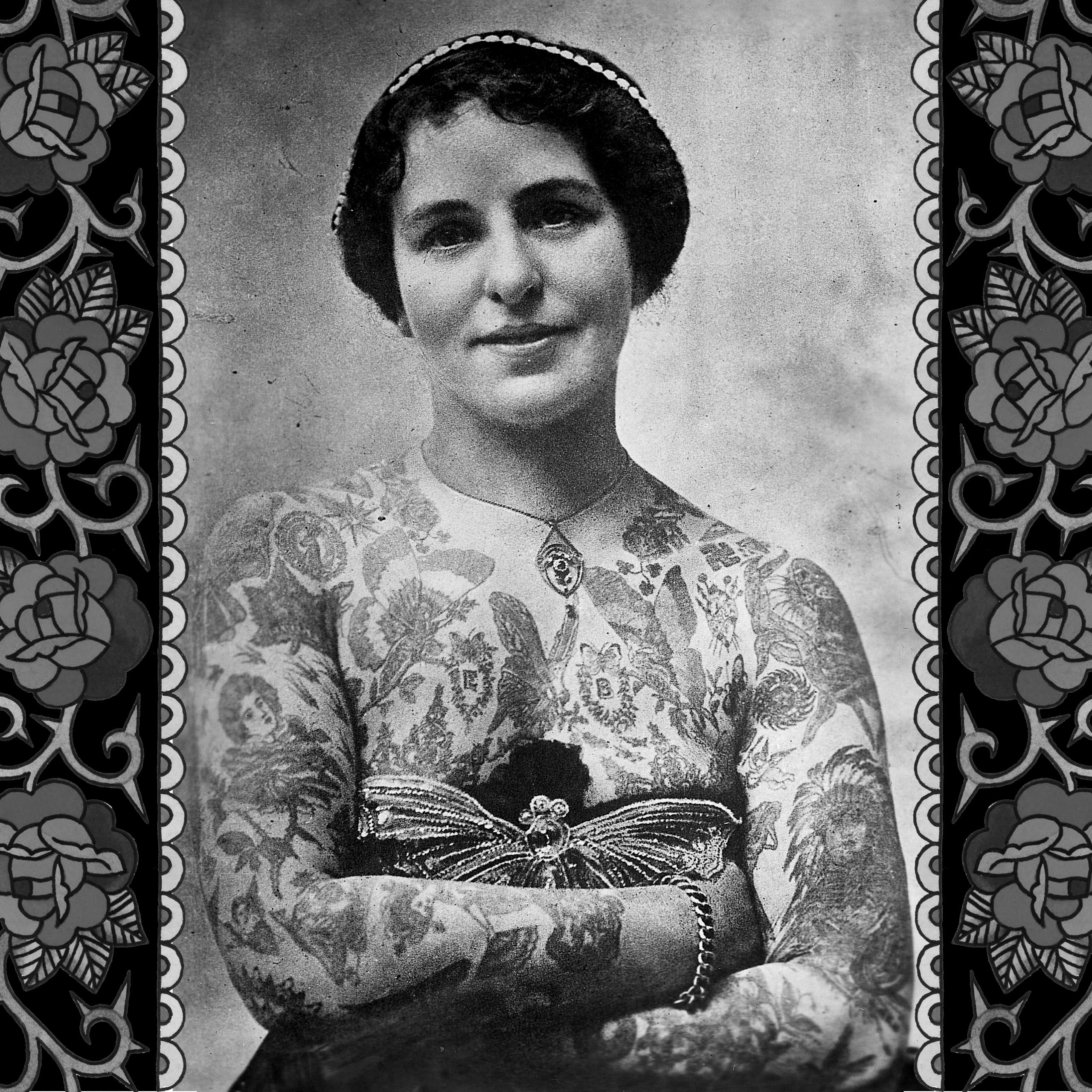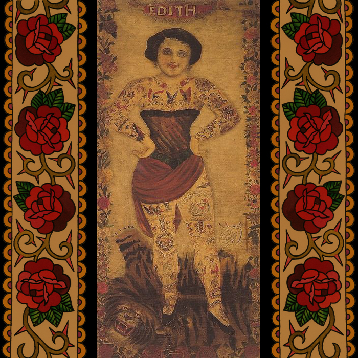 Edith’s tattoo collection included serpents, a Geisha, an Indian, a crucifixion scene, a red dragon, and copies of old master’s paintings. She had tattooed the WW1 allied flags on her breast.