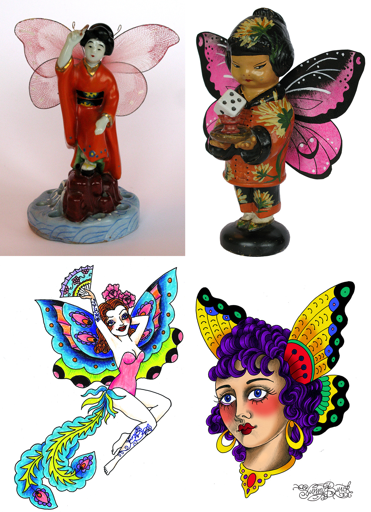 For years, the image of the butterfly woman has haunted me: the symmetrical, colorful wings of the insect added to the alluring femininity. I identify with the butterfly woman. I even made a collection of tattoo designs of her.