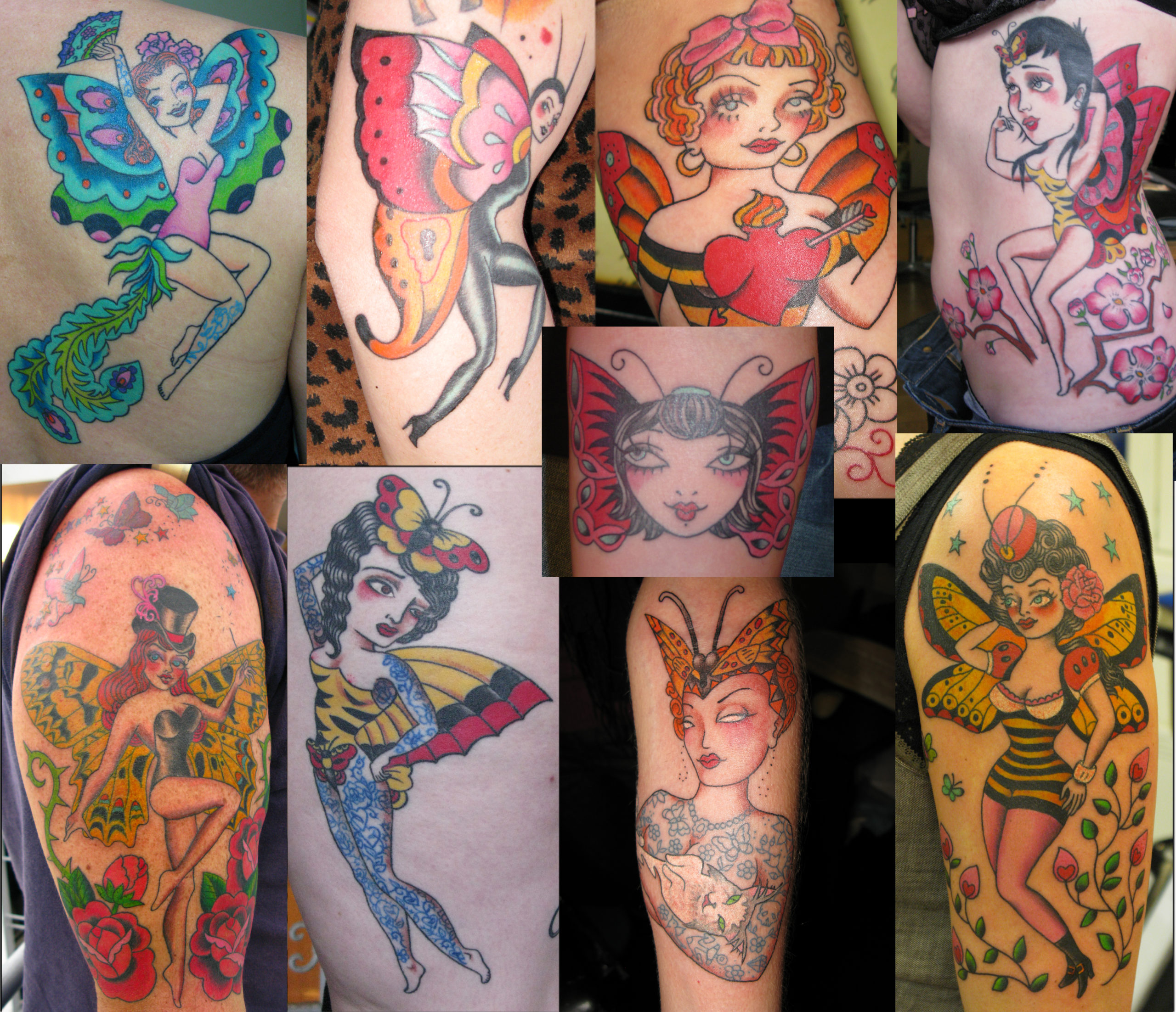 For years, the image of the butterfly woman has haunted me: the symmetrical, colorful wings of the insect added to the alluring femininity. I identify with the butterfly woman. I even made a collection of tattoo designs of her. This symbol, light and graceful, tickles my imagination, with visions of Victorian disguises. In Greek mythology, the butterfly represents the psyche, the destiny of the soul. The fragility of its existence evokes the swift flight of time. Later in Art History, 18th century vanitas serve to remind to abandon materialism and pretentiousness. All this speaks to me. I see the butterfly woman as a metaphor for the artist who has the power to take raw material and transform it into something that expresses the sensitivity of her soul. Another interpretation that interests me in the concept of the butterfly is that it is attracted to the light and its mystical counterpart: spirituality. Her way of flying towards a floating, carefree existance, is enviable. My painting “Social Butterfly” with her rose tattoos represents, for example, the freedom to have successive love stories. I like the combination of humor and melancholy in her choices.