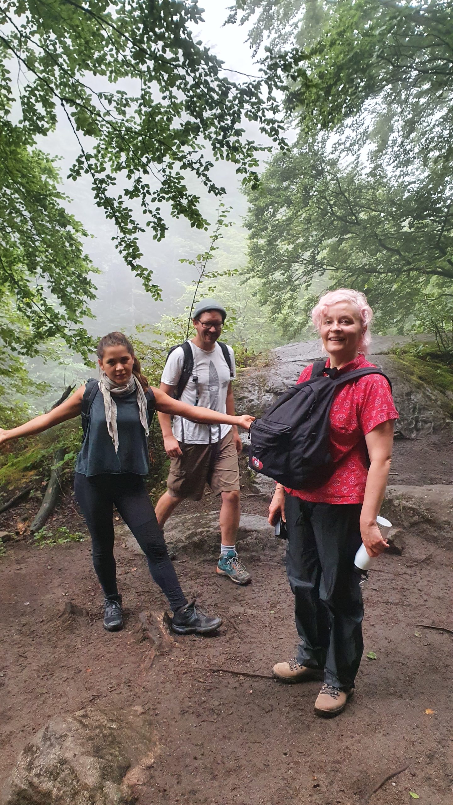 Our group included people from Italy, Canada, Greece, Ireland, England, Scotland, America and France. Quite a variety of locations! No two people from the same place. The last night we all packed into two cars and drove, then hiked to the top of a mountain to see the sunset. This photo is of all the artists and the team who facilitate.