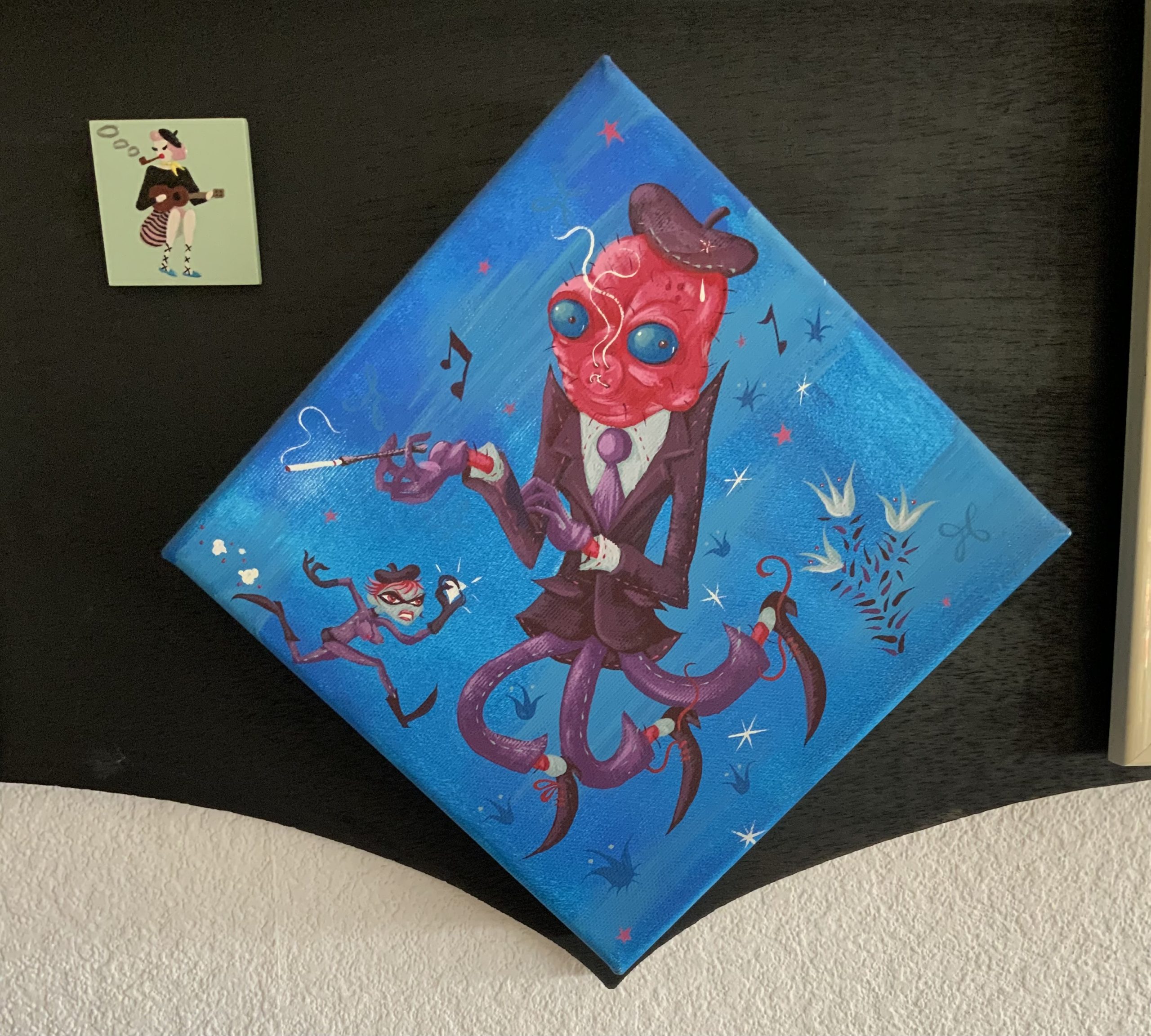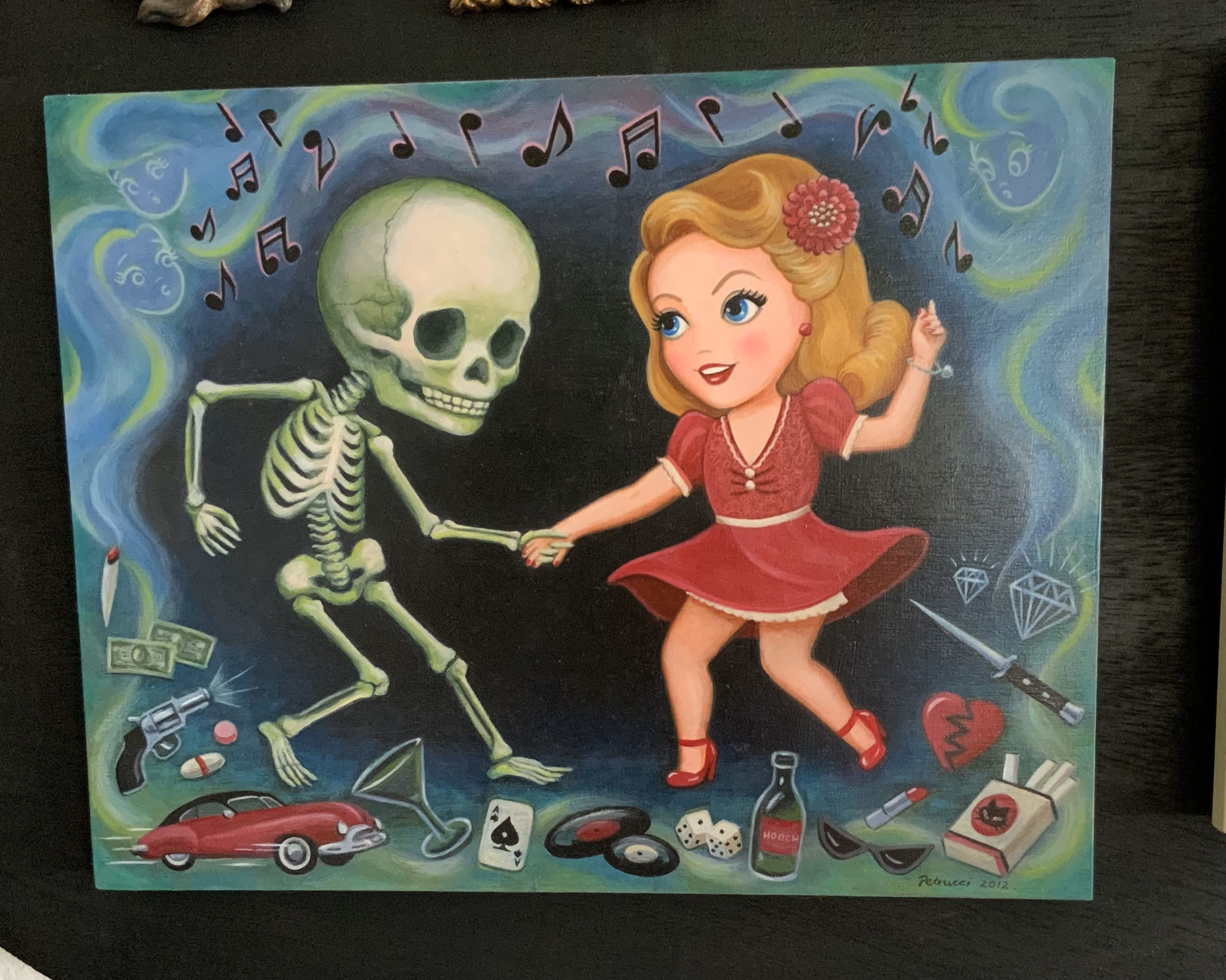 My subsequent purchase, a painting by my friend Lisa Petrucci, similarly filled me with apprehension. After patiently waiting for the right piece, I seized the opportunity when This piece of a girl dancing with a skeleton, that I thought I had missed out on, resurfaced at La Luz de Jesus gallery. Though another seemingly extravagant expense, owning what I consider her finest work brings unparalleled fulfillment. Also, knowing I’ve bolstered her artistic endeavors.