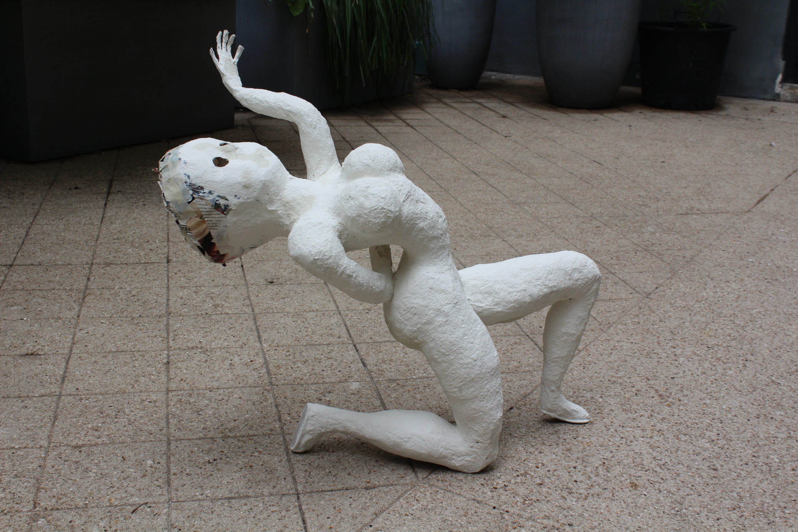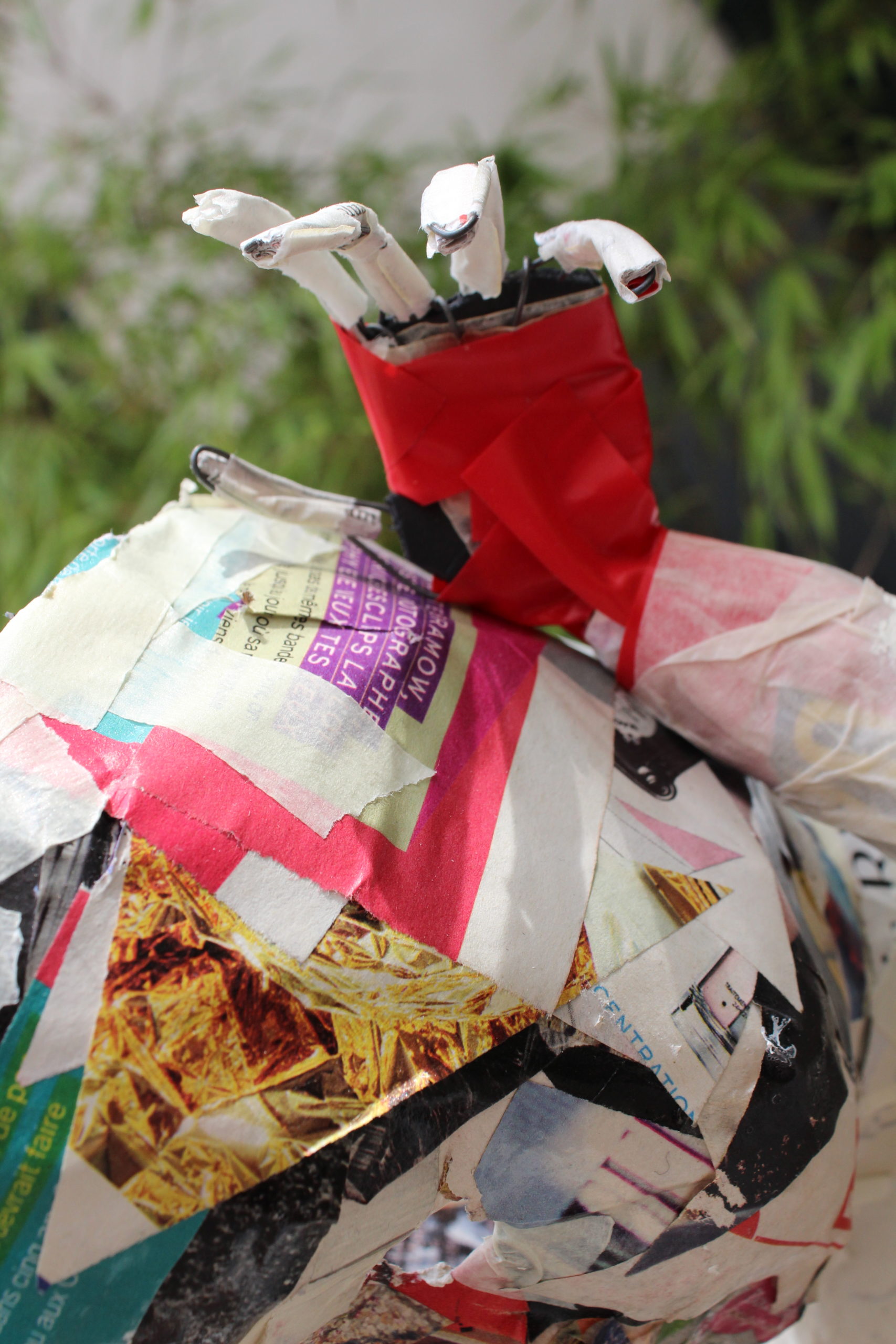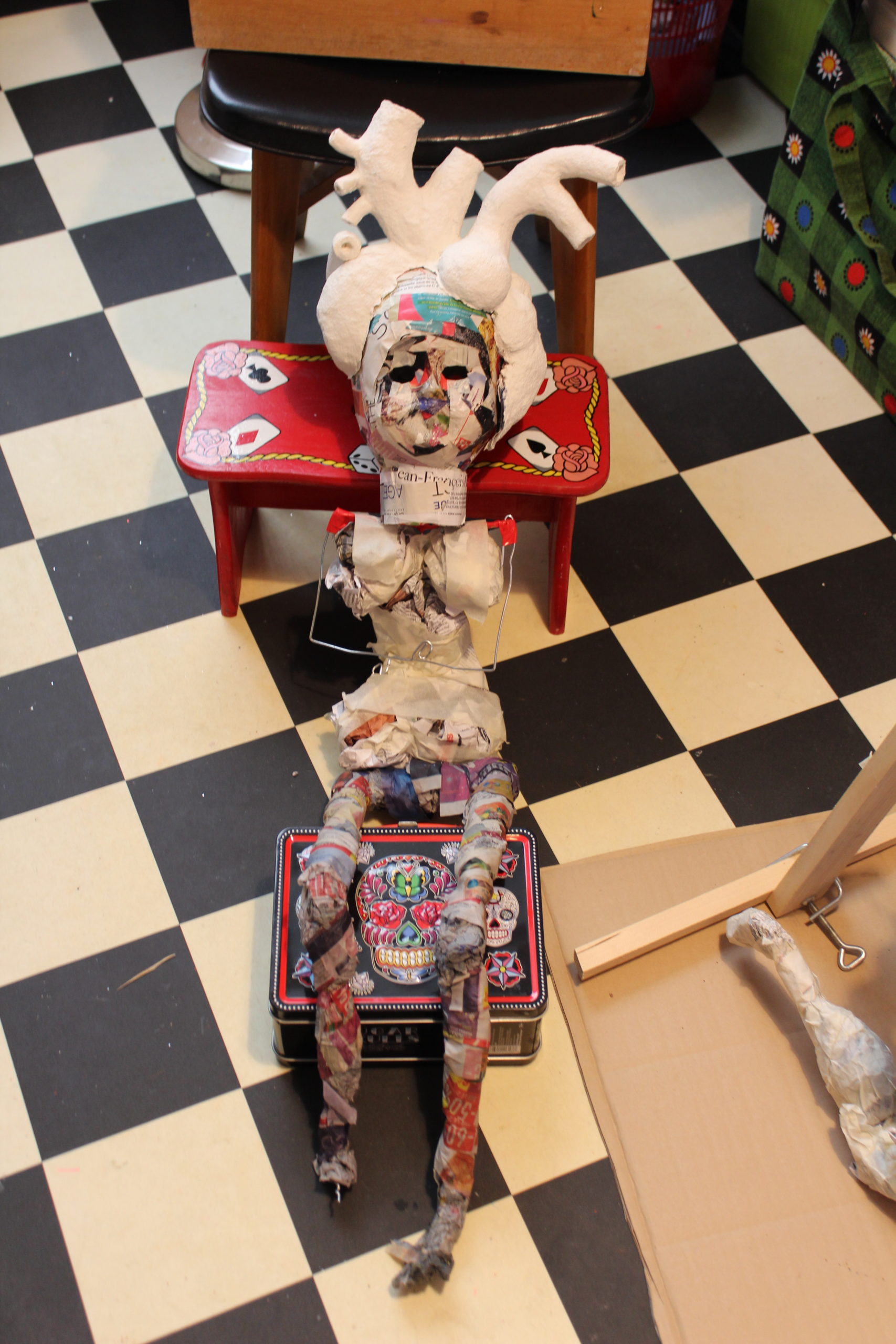 I began by constructing a wire skeleton, then built up the form using balled-up newspaper and tape. Uncertain about sculpting the face, I used a doll head as a base, layering it with glue and newspaper strips to ensure the proportions were right.