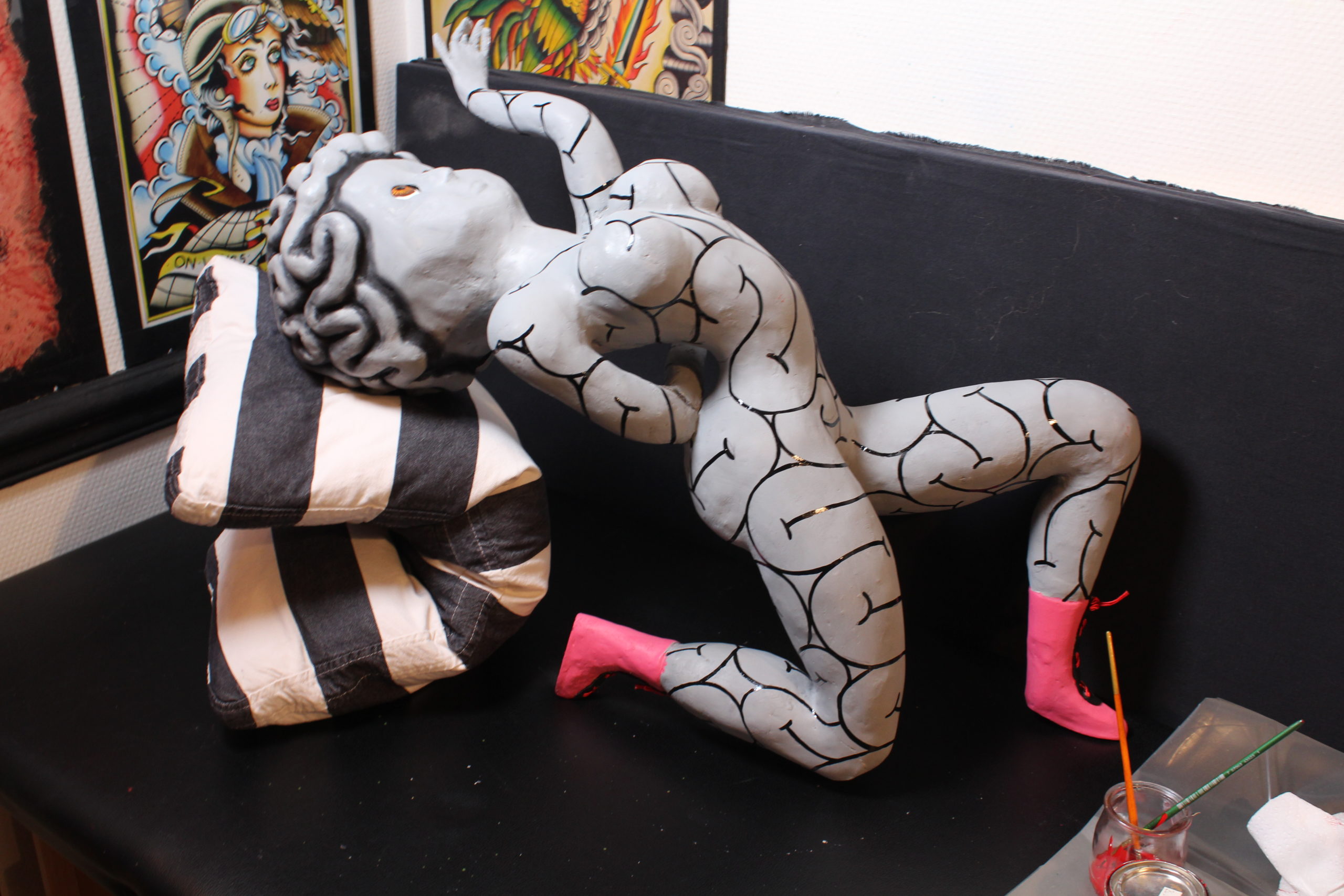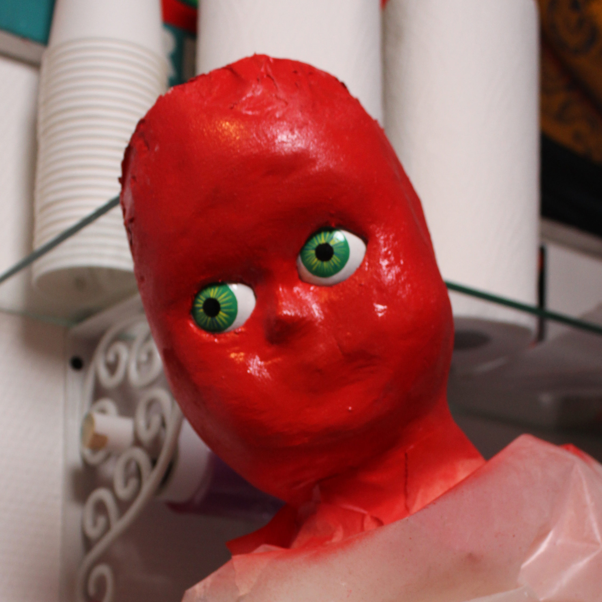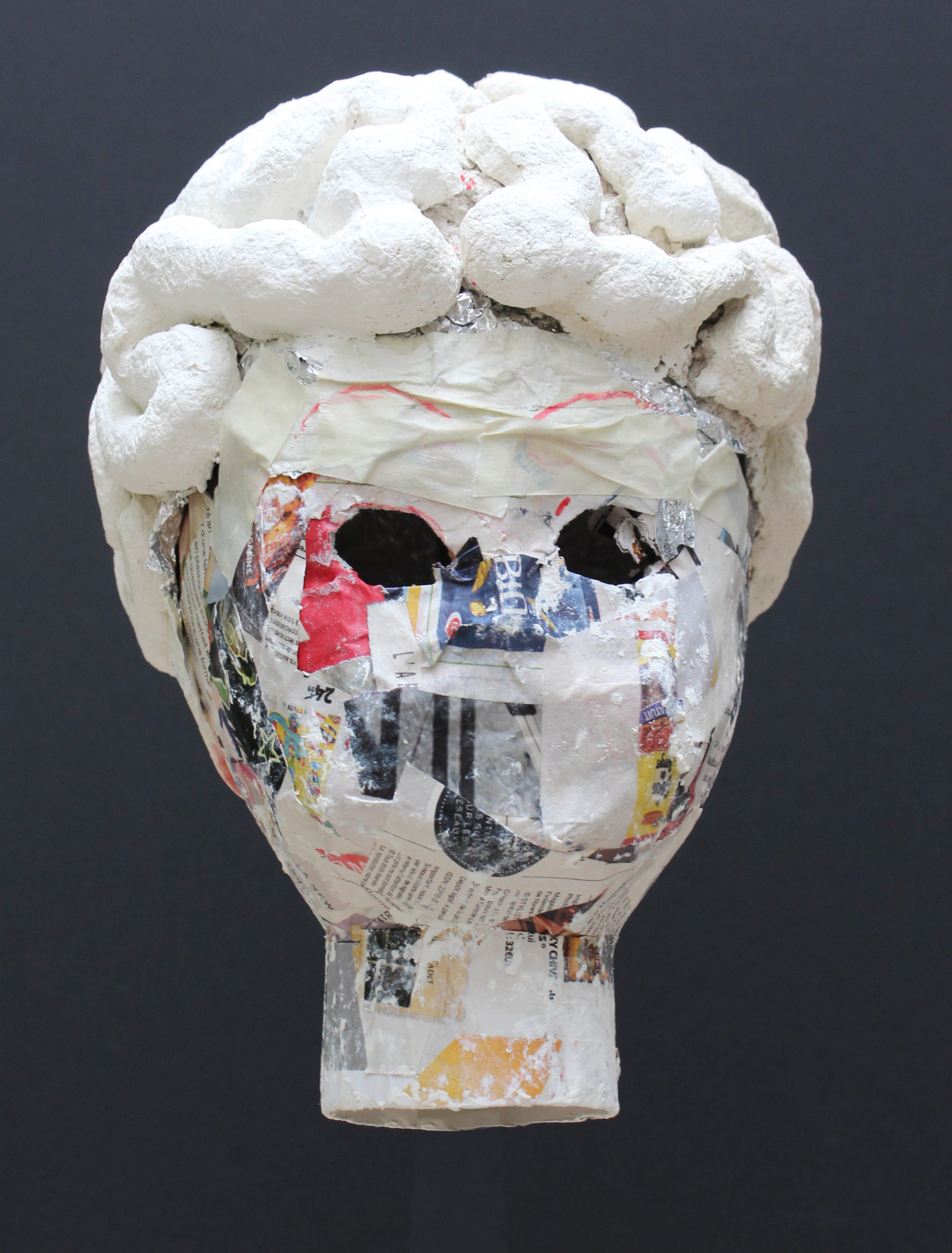 I began by constructing a wire skeleton, then built up the form using balled-up newspaper and tape. Uncertain about sculpting the face, I used a doll head as a base, layering it with glue and newspaper strips to ensure the proportions were right.
