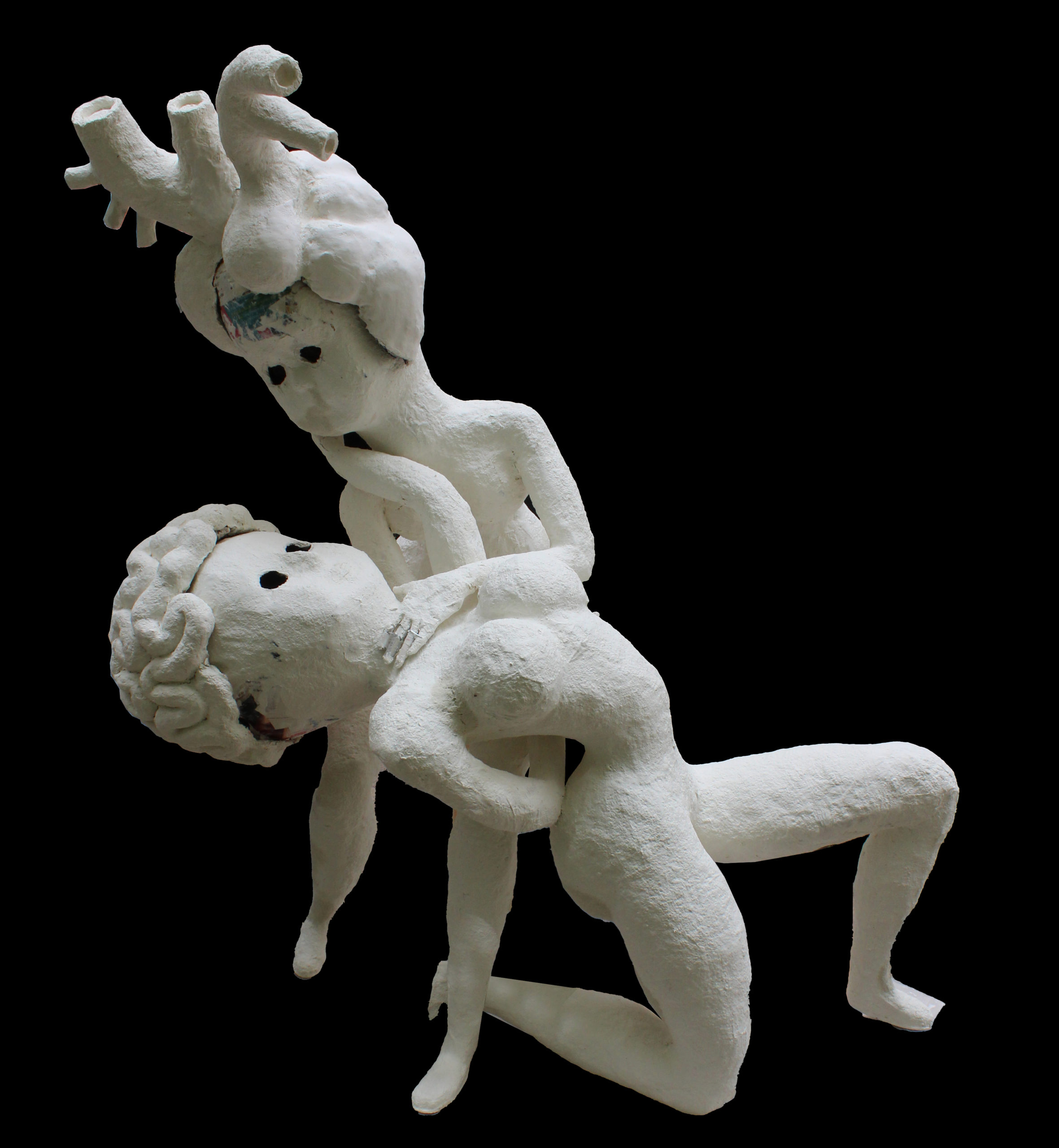 The sculpture represents two female wrestlers—embodying the heart and the brain—locked in conflict. Tension arises from struggle, manifesting in flesh, bone, sweat, and pain. What begins as a debate escalates into an altercation where logic clashes with instinct, reason with emotion. Their fight appears unresolved, yet they are deeply connected—sisters, soulmates, perhaps even twins. In their duality, I see the past and future, good and evil, resistance and resolution.