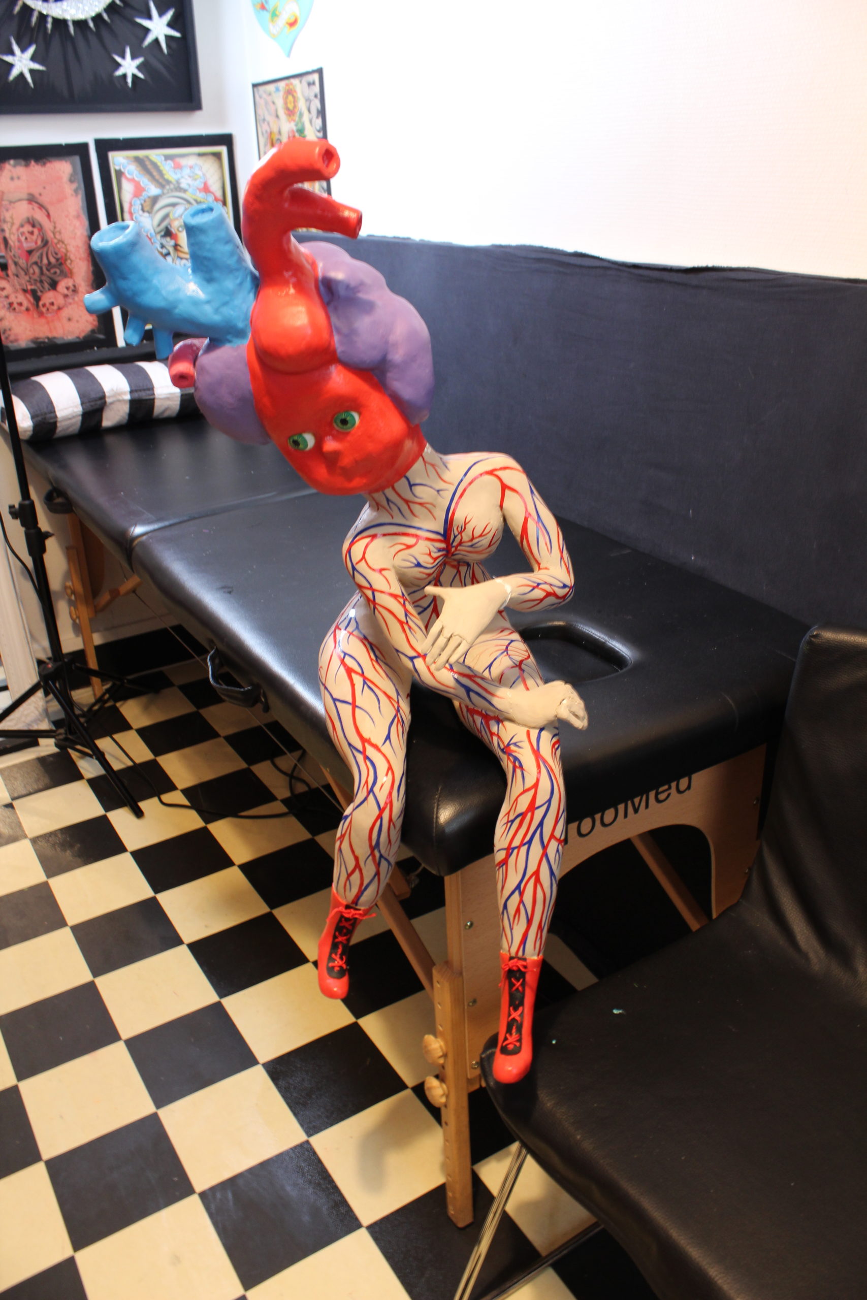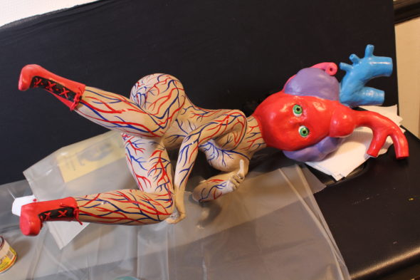 To shape the heart’s arteries, I bundled and rolled newspaper, cutting it into sections. I then used powdered papier-mâché to refine the lips, edges, and overall form. For the brain, I sculpted sausage-like folds from papier-mâché paste, using reference images for accuracy.