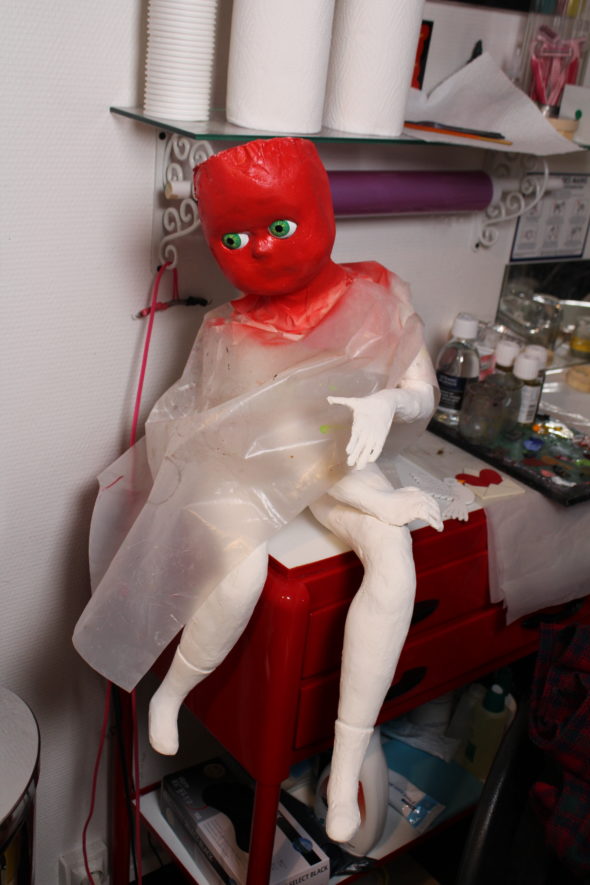 Before sealing the heads, I attached the eyes—made from cork balls, coated with eight layers of gesso, and detailed with enamel paint. Once the heads were closed, I taped off the eyes to continue painting. The bodies were base-coated with spray paint, then refined with enamel details. I added false eyelashes from my collection and created the boot laces from faux leather and cording, gluing them onto the sculpted leg forms.