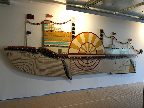 Installations : Il a réalisé un bateau à vapeur/baleine géant en bois pour les bureaux de Facebook à Seattle.