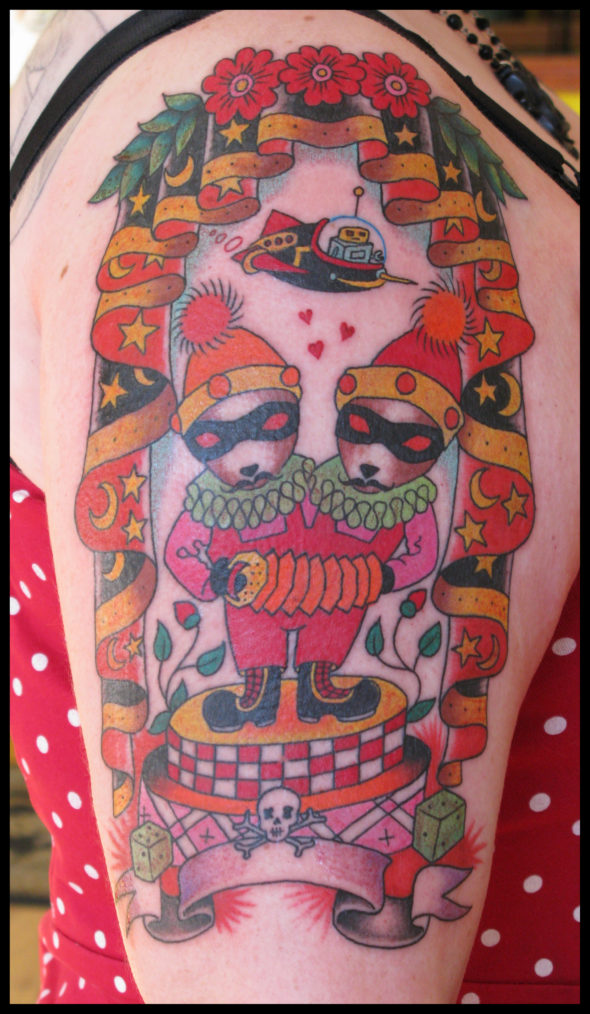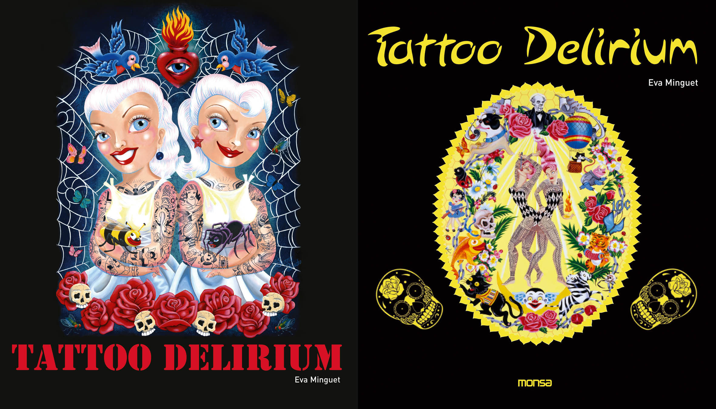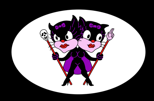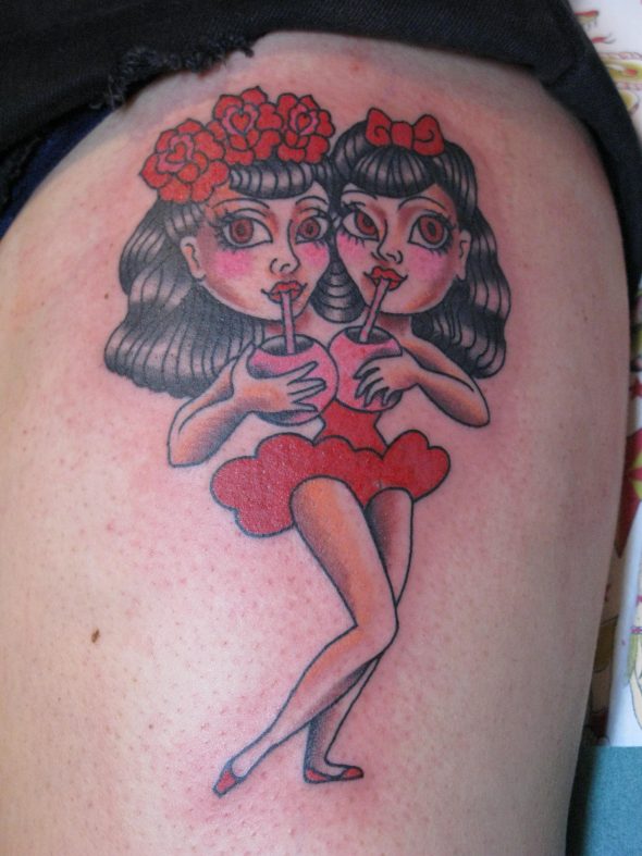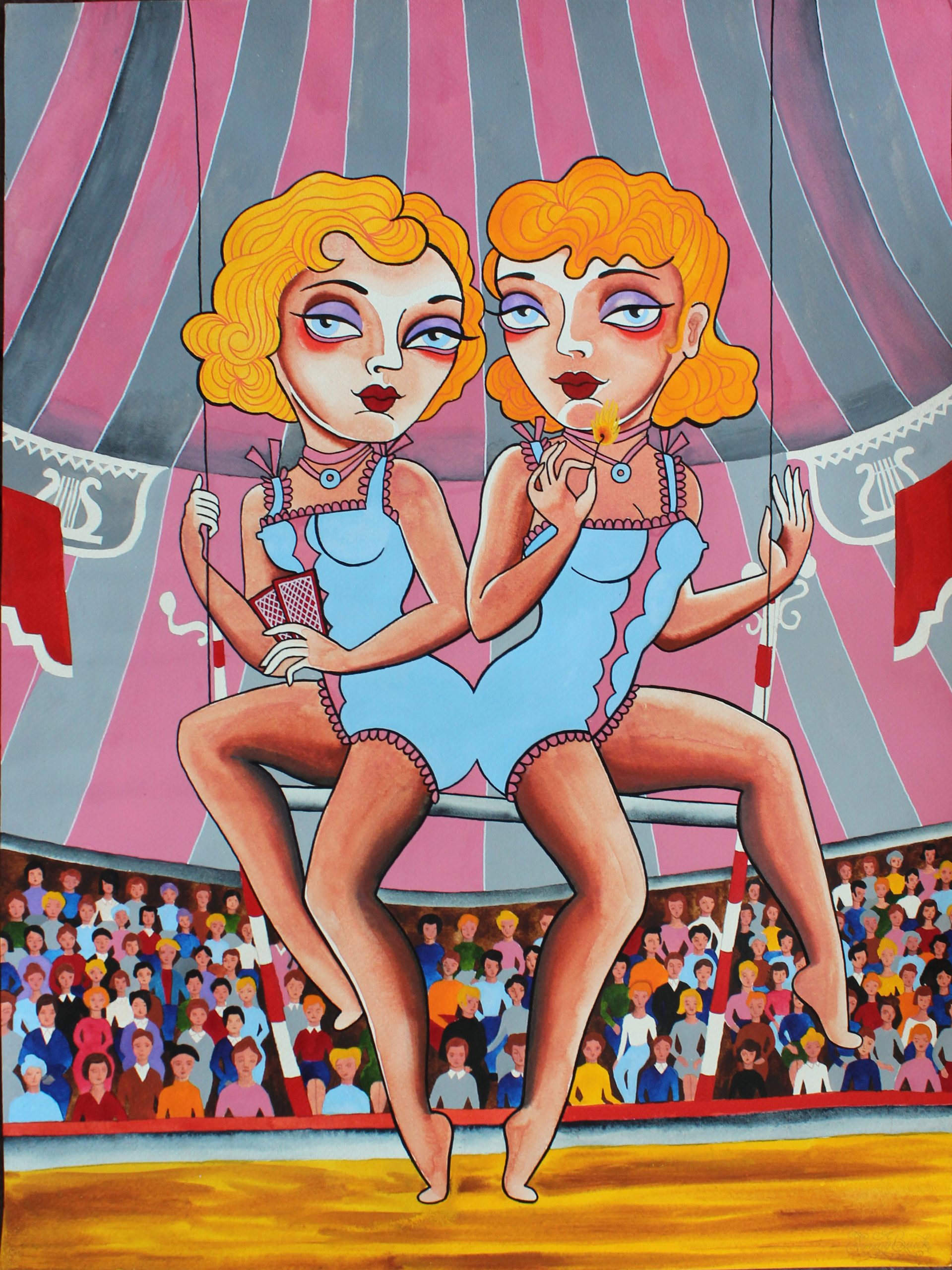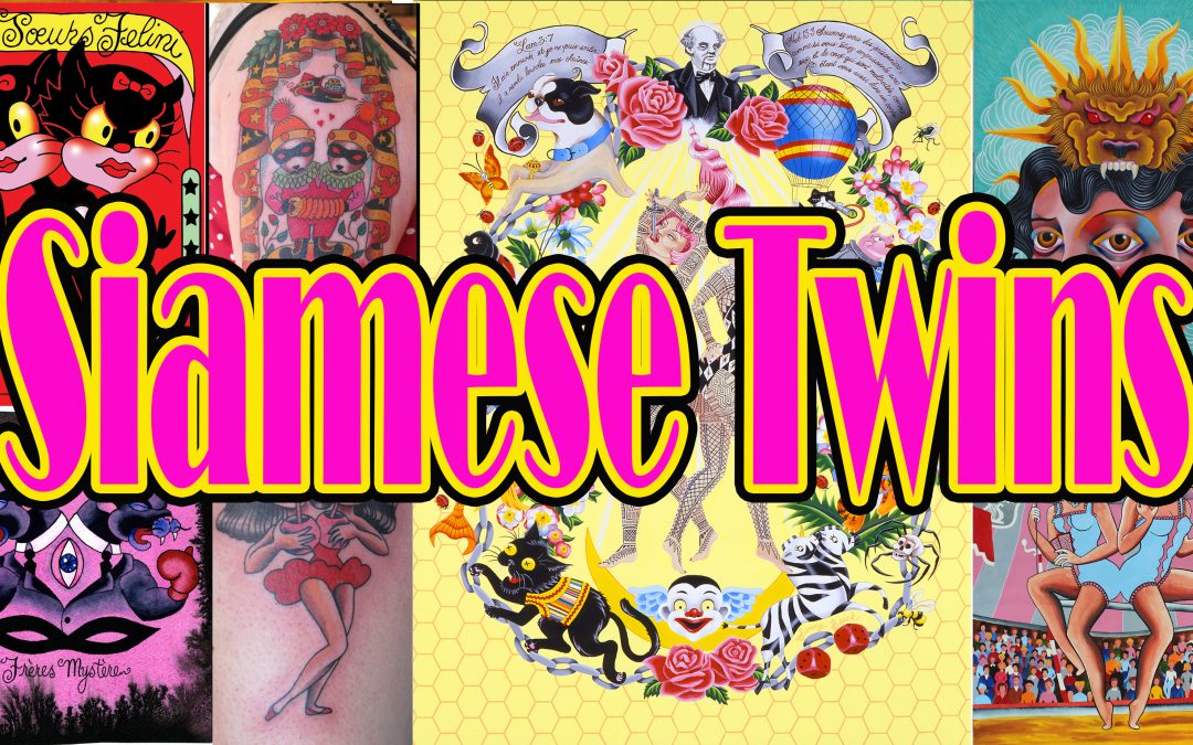 The imagery is also personal. I carry a tattoo on my back of Siamese twin cowgirls — part of a larger sideshow tableau. And I collect images of twins created by other artists: twin mermaids, conjoined Jesuses. These references form a visual language that continues to expand.