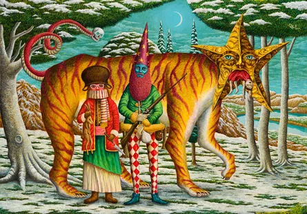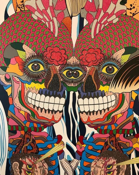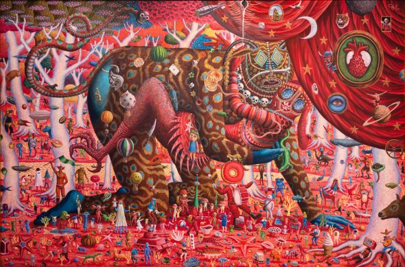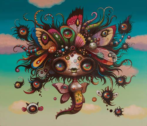 Over time his work evolved into the unmistakable hand-drawn psychedelic style for which he is now best known. Later paintings and illustrations became increasingly intricate and surreal, filled with hybrid creatures, dreamlike landscapes, and wildly imaginative figures. His drawings often feel like vivid dreams or fever visions, packed with symbols, bright colors, and swirling forms that seem to spill across the surface.