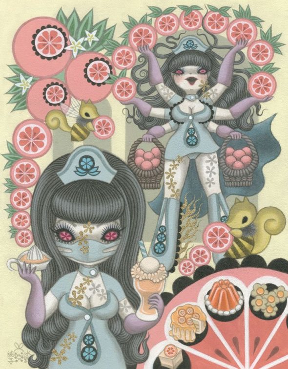 Junko Mizuno is a Japanese artist and manga creator best known for her bright, cartoonish style paired with dark, adult themes. Drawing from shōjo manga, horror, and pop surrealism, her work reimagines fairy tales and folklore through a lens of feminism, humor, and grotesque fantasy.