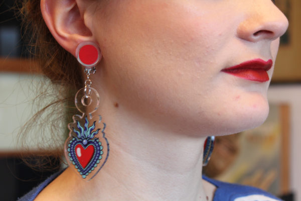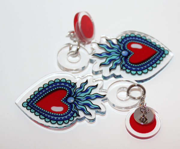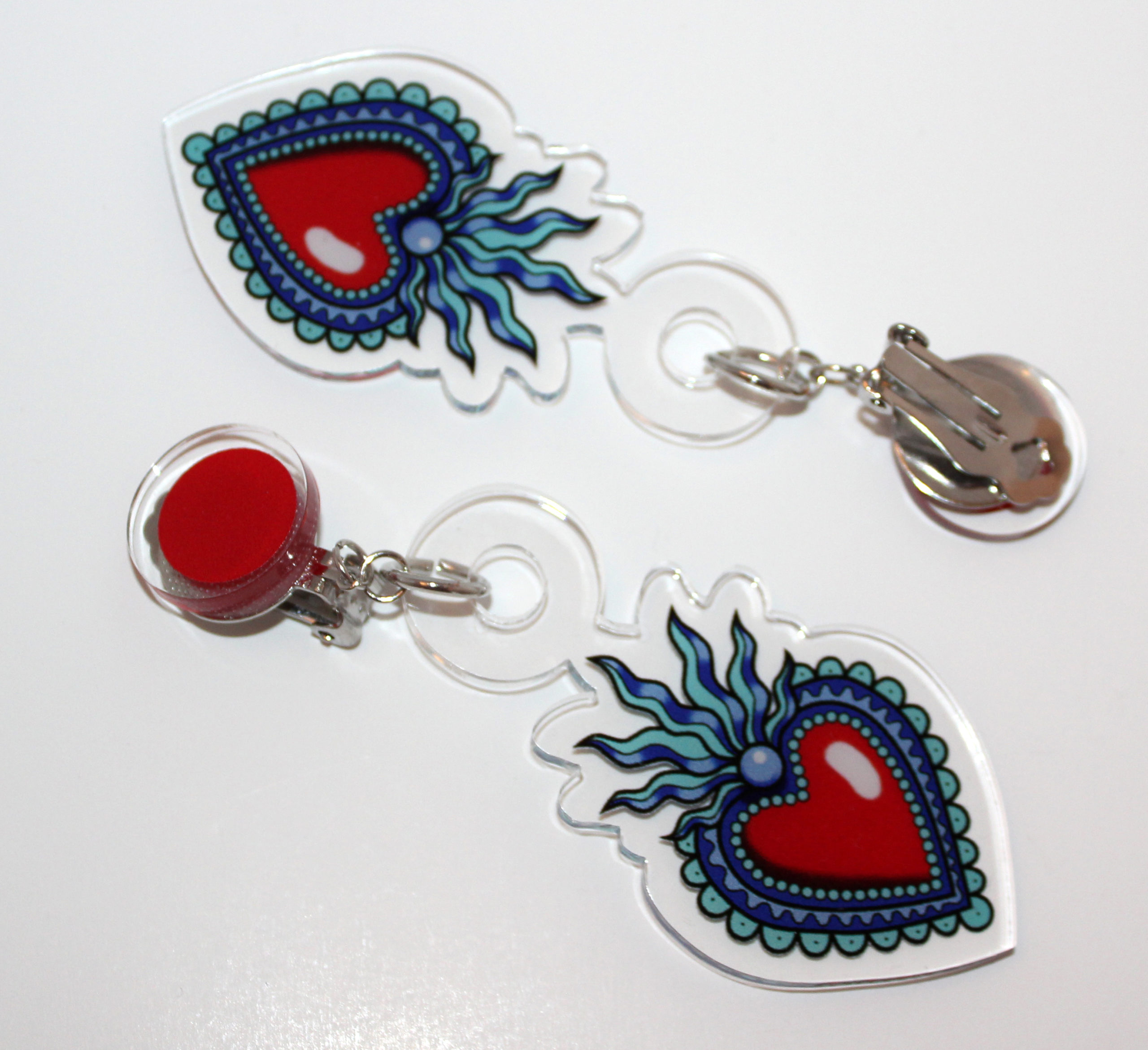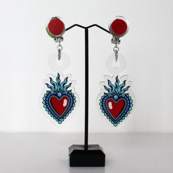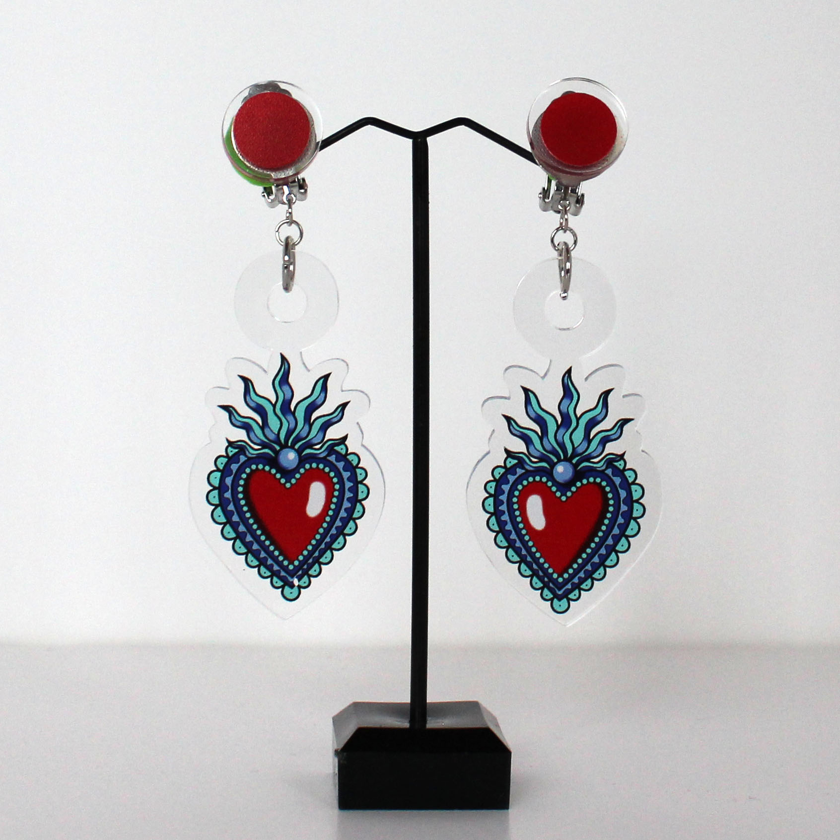 Blue Flame Red Heart Plastic Earrings- by Sunny Buick