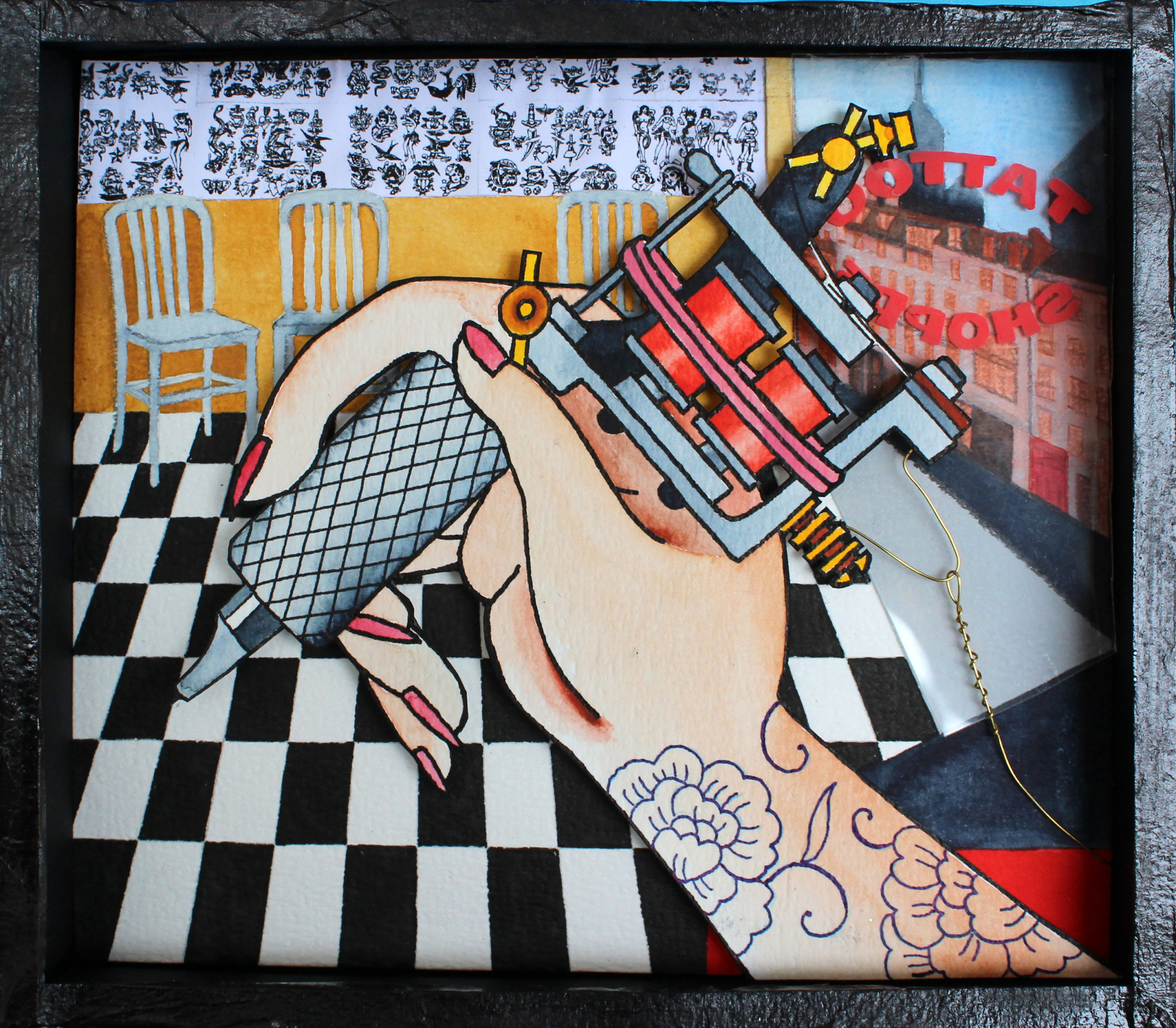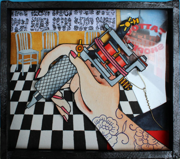 This is a collage/multi-media original painted object